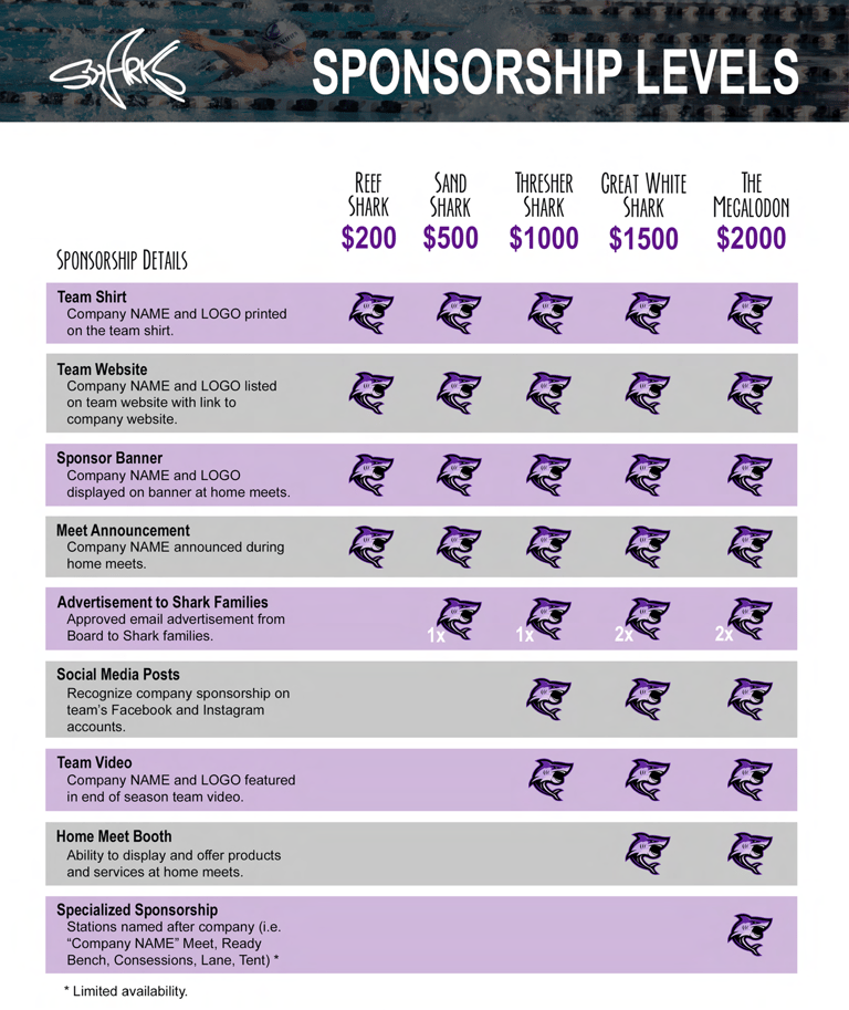 We hope we can count on your donation and consider becoming an honorary Shark by making a financial contribution this swim season! If you wish to become one of our team sponsors, please click here to download the application.