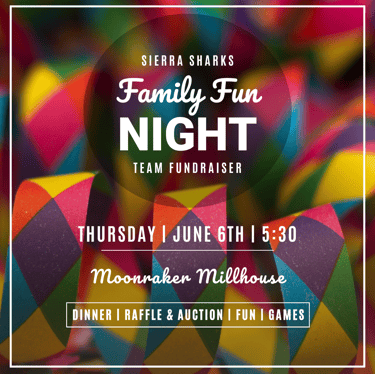 Being able to provide a fun and enriching summer experience for our swim families, requires fundraising efforts, along with partnerships with great sponsors. This season, we decided to limit the amonts of dineouts to just a single event, being held at BJ's in Folsom. Also, we are having our Family Fun Night team fundraiser event at Moonraker Millhouse in Cameron Park, where families can come to enjoy each others company, raffles, delicious food, and to play games.